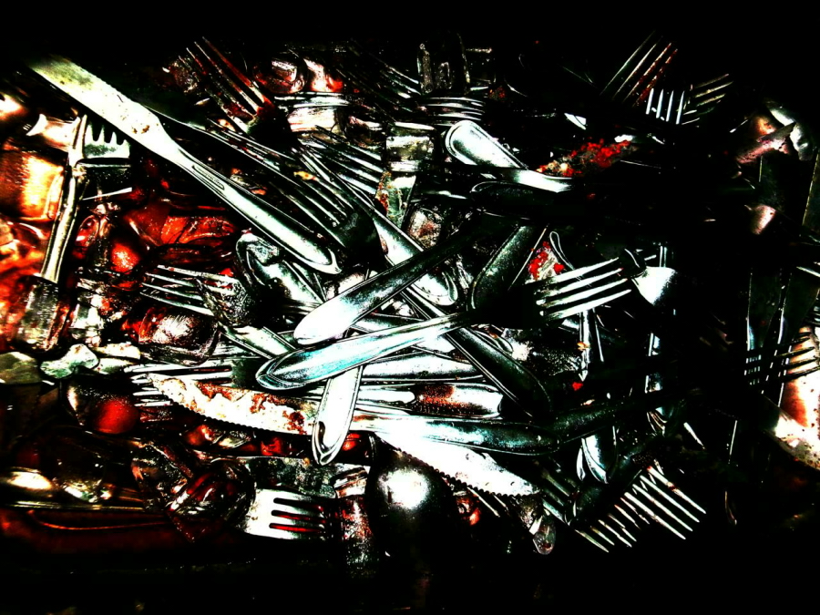 Outras três são rascunhos de talheres, muitos talheres jogados, onde Sérgio consegue, com sua interferência, fazer brilhar a cor cinza dos mesmos, tornando-os pura prata. “Isso não é uma pia. É uma bacia onde os talheres vão ser lavados no restaurante que eu frequento, o KiloMania. A inspiração é o movimento de todo dia. É um diário de garfos e facas”, explica o artista. E é, tanto isso, que a próxima obra, você se depara com uma Bíblia velha, em cima de um saco de lixo, aberta no livro dos Salmos. Quer mais que um diário “de garfos e facas” do que isso?!